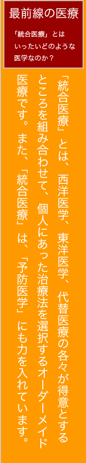 「統合医療」とは、西洋医学、東洋医学、代替医療の各々が得意とするところを組み合わせて、個人にあった治療法を選択するオーダーメイド医療です。